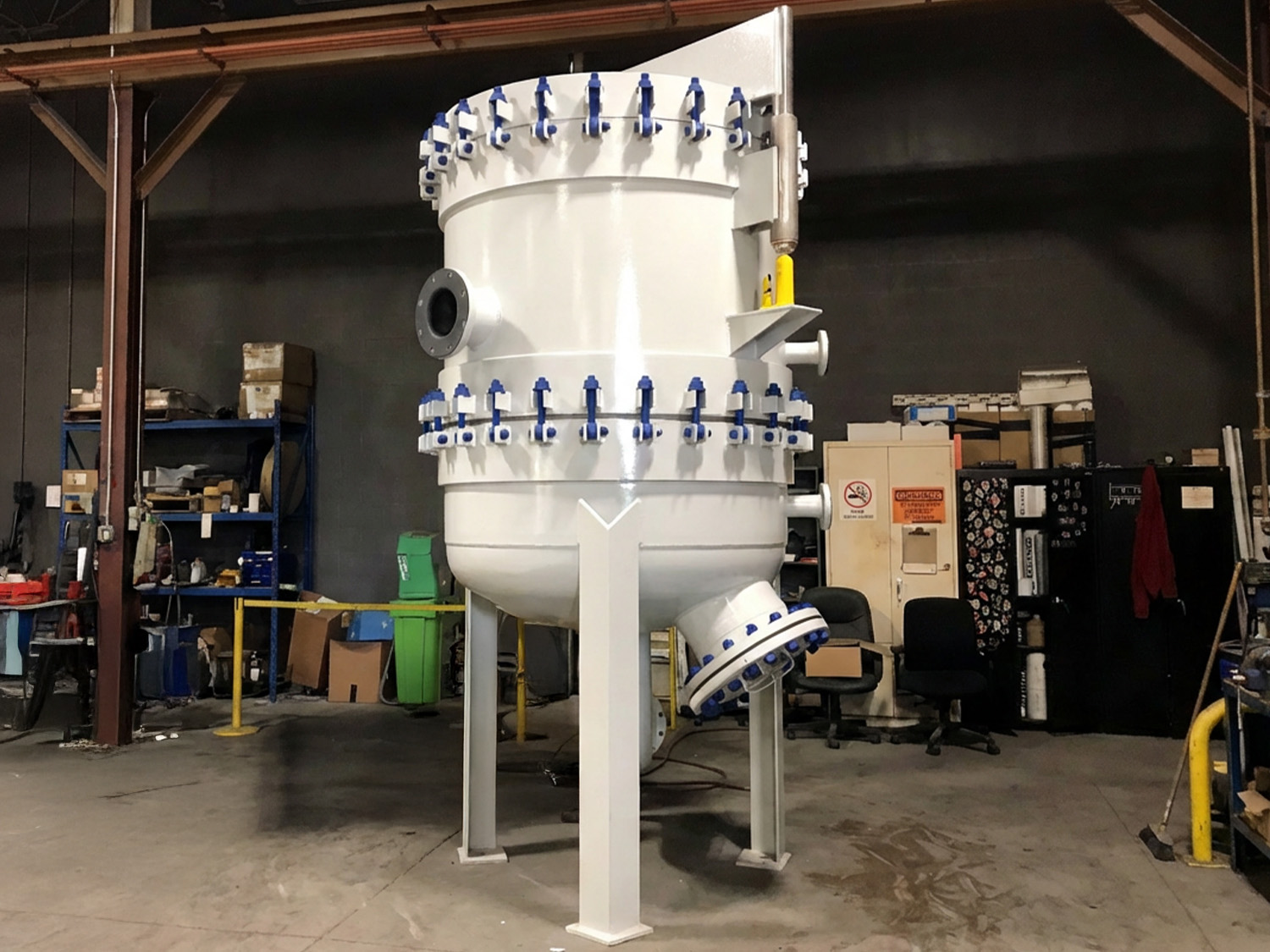 A chemical processing facility required filtration for aggressive brine service at 750 GPM per vessel. Fil-Trek engineered and supplied large, vertical L-Series multi-cartridge filter housings configured specifically for high-pH brine.